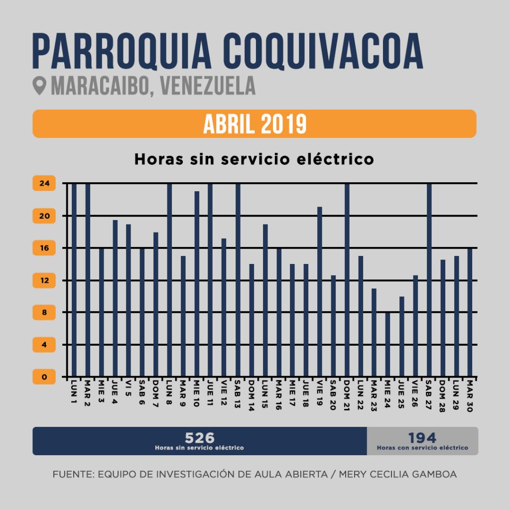 Respecto a la investigación realizada, Aula Abierta pudo observar que durante el mes de abril de 2019 la Parroquia Coquivacoa estuvo 526 horas sin servicio eléctrico de las 720 horas en total que tuvo el mes de abril. Además, no contó con servicio eléctrico durante 2 días continuos, alcanzando a sumar 7 días completos en los que no les fue suministrado el servicio.