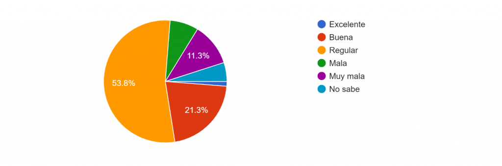 Del grupo de estudiantes que afirmó contar con servicio de internet, el 53.8% considera que la calidad es regular, el 21.3% la evalúa como buena, mientras que en el otro extremo el 11.3% dice que es muy mala y sólo el 1.3% catalogó de excelente. El siguiente gráfico describe los resultados obtenidos:
