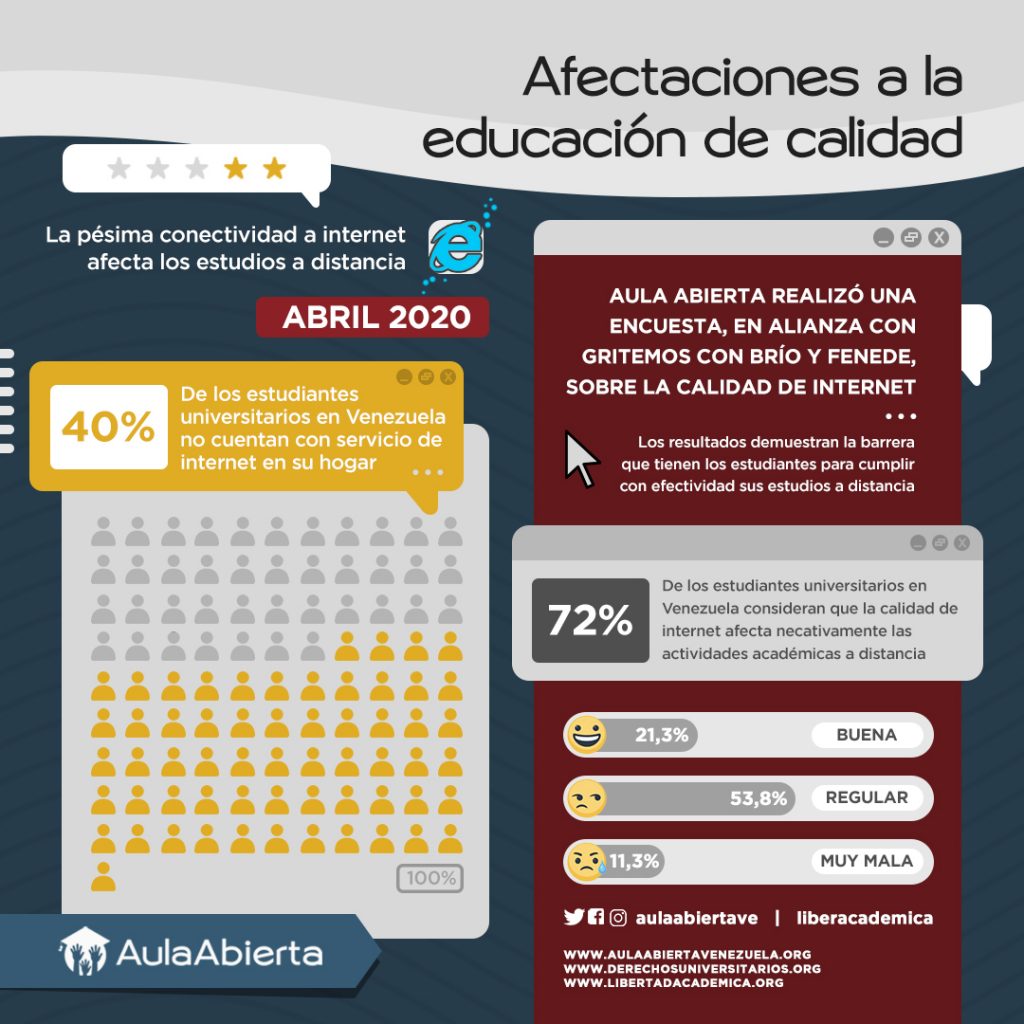 La encuesta les permitió determinar que el 76.6% de los encuestados no se encuentran en condiciones mínimas para ver clases a distancia, debido a la imposibilidad del acceso a un buen servicio de internet, aunando factores extras como los cortes del servicio eléctrico y la Emergencia Humanitaria Compleja que viven.
