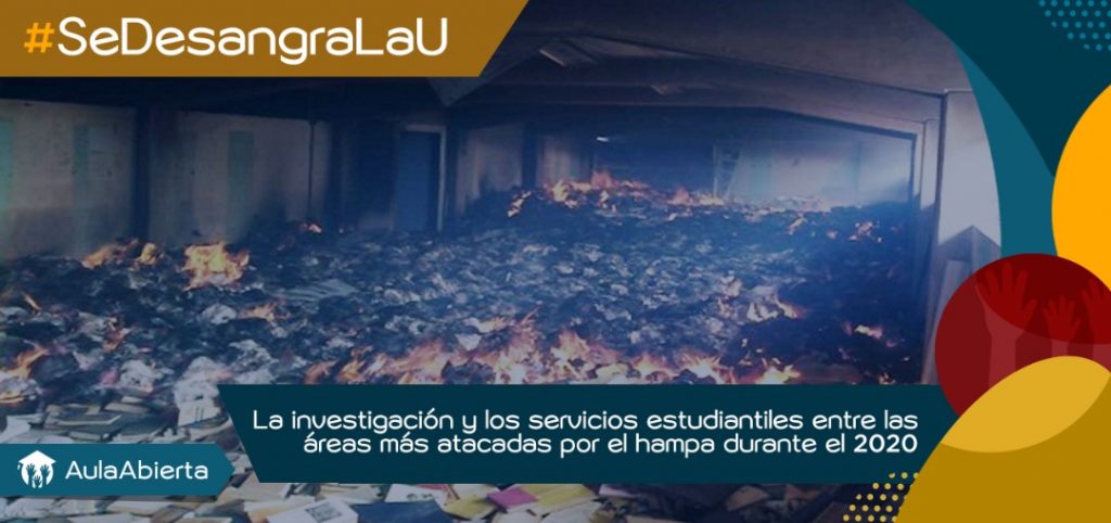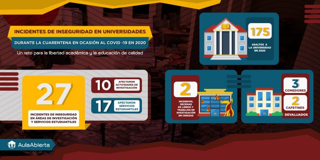 Desde el decreto de cuarentena social, anunciada por las autoridades del Estado, se han suscitado en las instalaciones universitarias una cuantiosa cantidad de hurtos, robos, saqueos, destrozos y desmantelamientos sistemáticos: Aula Abierta constató que, entre marzo y diciembre de 2020, se efectuaron 175 incidentes de inseguridad.