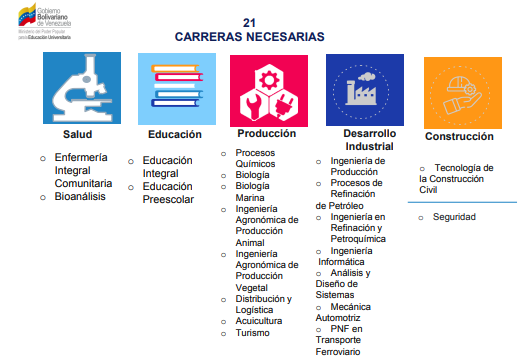 El Ministerio del Poder Popular para la Educación Universitaria presentó un nuevo programa de carreras denominado plan de “Redimensionamiento del Sistema Nacional de Ingreso Universitario, basado en la reactivación del aparato productivo nacional”.