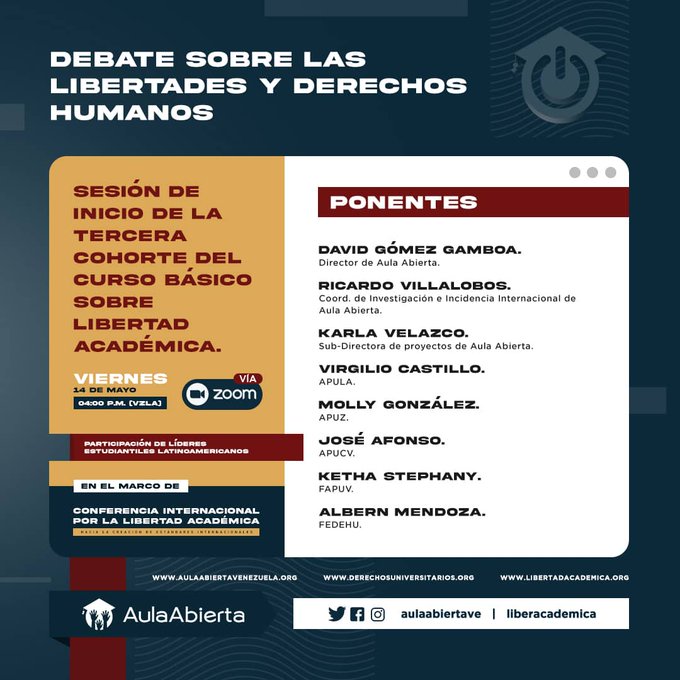 En el marco de la Conferencia Internacional Online por la Libertad Académica, Aula Abierta realizará el «Debate sobre las libertades y derechos humanos», a desarrollarse como sesión de inicio de la tercera cohorte del Curso Básico sobre Libertad Académica.