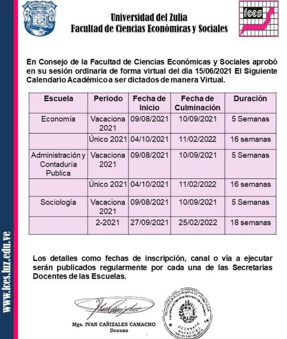 El Consejo de la Facultad de Humanidades y Educación, en sesión ordinaria, aprobó el cronograma académico del período Único-2021 (U-2021) a realizarse de forma virtual, con una duración de 17 semanas y del período Vacacional 2021, que tendrá una duración de cinco semanas para desarrollarse desde el 02 de agosto hasta el 03 de septiembre.