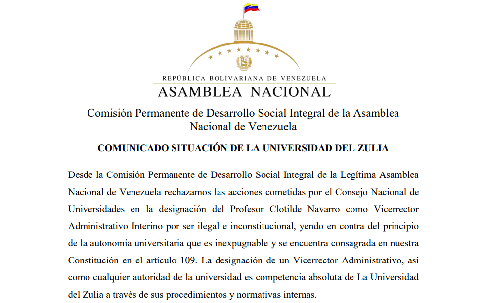 El Parlamento emitió un comunicado este 14 de febrero en rechazo de la designación de Navarro y reconoció a la Dra. María Artigas como Vicerrectora Administrativa “interina”, quien fue ratificada por el Consejo Universitario de LUZ el pasado 22 de enero de 2020.